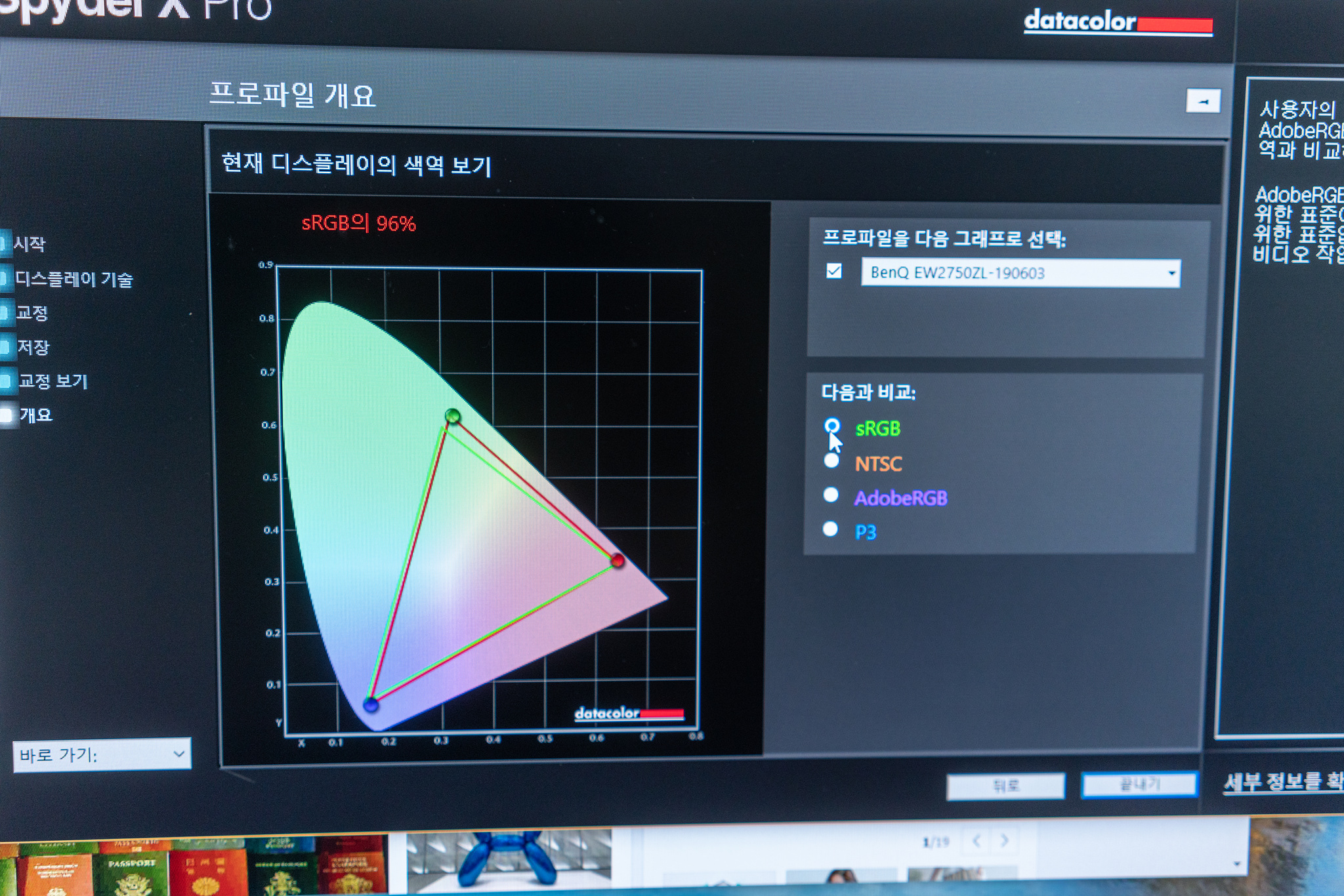 마지막 순서는 현재 디스플레이의 색역을 그래픽으로 표현해주며 끝난다. 모니터를 처음 사고 캘리브레이션을 했을 땐 sRGB의 99%였는데, 지금은 96%라고 뜨는 것을 보니 3년이 넘어가니 모니터의 수명도 안녕중인 셈이다. 다음엔 AdobeRGB를 지원하는 모니터로 바꾸기 위해 총알을 모아야 할 듯하다. 장비병은 낫지 않는 병이니까. 제사보다 젯밥에 관심 있는 나를 합리화하며.